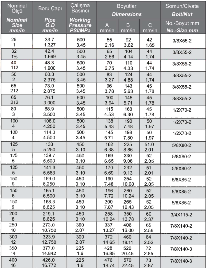 Duktil dökme demir parçalar ASTM A536 ve ISO 1083 standartlarına uymaktadır. Malzeme üzerinde gelen EPDM contalar ISO 6182 standardına ve FM 1920 ve UL 213 normlarına uygun olarak üretilmiştir. Cıvata ve Somunlar ASTM A813 Standartlarına uygun olarak Isıl işlem görmüş, çinko kaplama karbon çeliğinden imal edilmiştir.